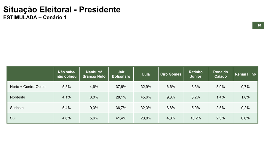 O estudo, realizado entre os dias 17 e 21 de agosto de 2025 por meio de entrevistas pessoais, mostra o presidente Luiz Inácio Lula da Silva (PT) e o ex-presidente Jair Bolsonaro (PL) tecnicamente empatados no primeiro turno. A margem de erro é de 2,2 pontos percentuais, com grau de confiança de 95%.