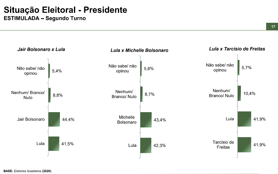No entanto, nas projeções de segundo turno, o cenário se torna mais desfavorável ao presidente. Contra Jair Bolsonaro, Lula aparece atrás: o ex-presidente teria 44,4% dos votos, contra 41,5% do petista. Em disputa com Michelle Bolsonaro, o resultado também é negativo para o presidente: a ex-primeira-dama venceria com 43,4% contra 42,3%. Já em um cenário contra Tarcísio de Freitas, o levantamento registra empate numérico, com 41,9% para cada um.