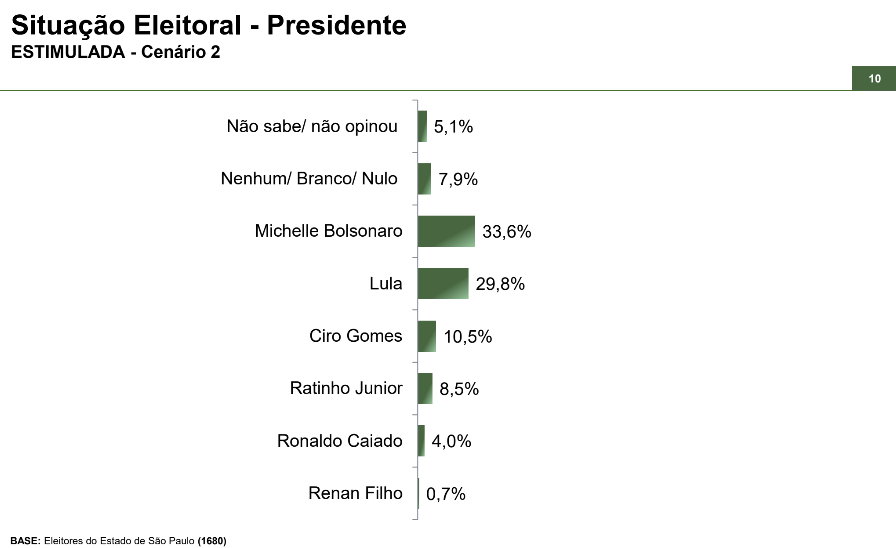A pesquisa também testou dois cenários com possíveis substitutos de Bolsonaro: sua esposa, Michelle Bolsonaro, e seu filho, o deputado federal licenciado Eduardo Bolsonaro (PL-SP). Com Michelle na disputa, ela aparece com 33,6%, contra 29,8% de Lula, um empate técnico. Já com Eduardo como candidato, Lula tem 30,1% e o deputado, 27,6%.