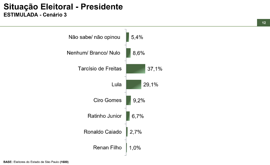Sem Bolsonaro na disputa, o nome mais forte é o de Tarcísio de Freitas, que lidera com 37,1% das intenções, enquanto Lula registra 29,1%. Ciro aparece com 9,2%, Ratinho Junior com 6,7%, Caiado com 2,7% e Renan com 1%.