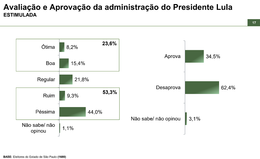 O levantamento também aferiu a percepção do eleitorado paulista sobre o governo Lula. Segundo os dados, 62,4% dos entrevistados desaprovam a atual gestão, enquanto 34,5% aprovam. A avaliação negativa do governo (ruim ou péssimo) chega a 53,3%, enquanto 23,6% classificam como bom ou ótimo e 21,8% consideram regular. Apenas 1,1% não soube responder ou preferiu não opinar.