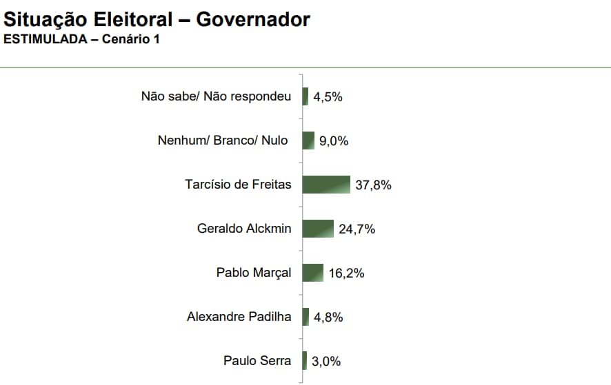 Já no cenário estimulado, em que os candidatos são apresentados, o atual mandatário paulista está na dianteira com 37,8%, logo atrás aparece Geraldo Alckmin (PSB) com 24,7%, e Pablo Marçal (PRTB) com 16,2%.