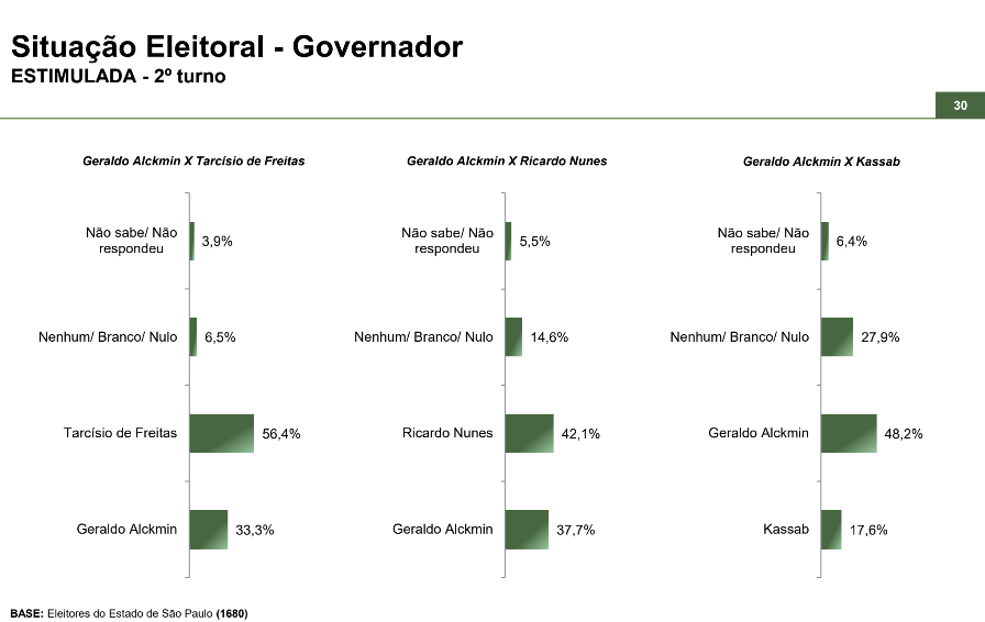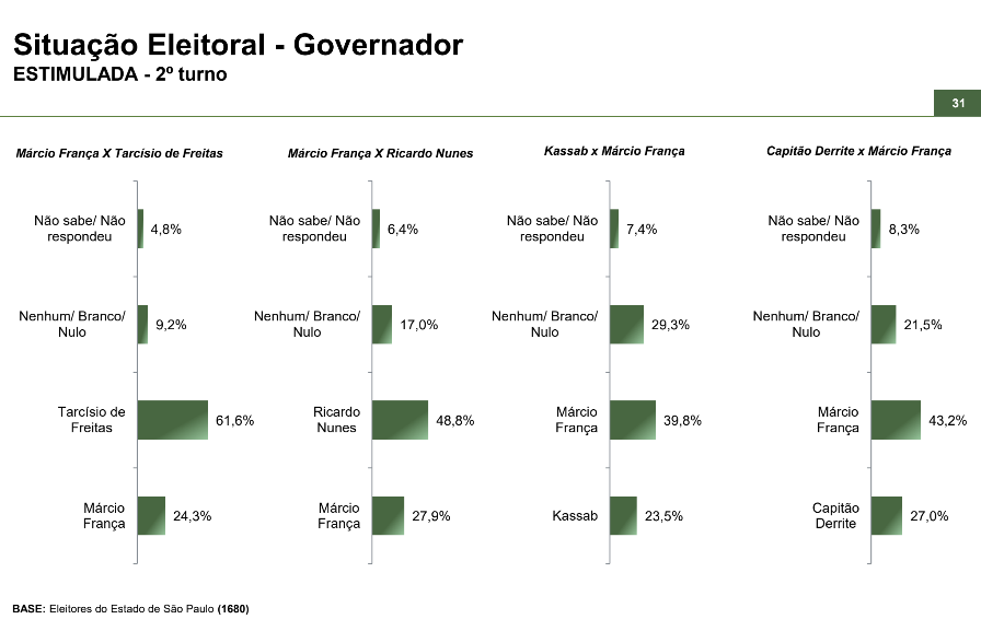 No segundo turno, os números também jogam a favor do atual governador. Ele venceria Alckmin por 56,4% a 33%, e superaria França por 61,6% a 24,3%.