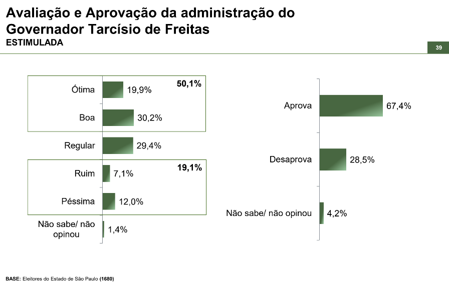 A boa colocação de Tarcísio nas pesquisas é sustentada por sua avaliação positiva entre os eleitores. De acordo com o instituto, 67,4% dos paulistas aprovam sua gestão, enquanto 50,1% classificam o trabalho como “ótimo” ou “bom”.