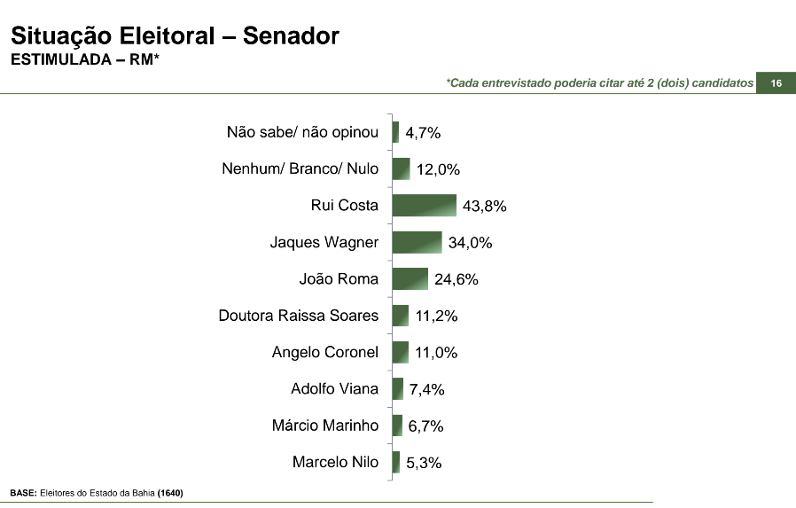 Por outro lado, em uma situação estimulada, quando cada candidato poderia citar até dois candidatos, Rui Costa ficou em primeiro lugar com 43,8% das intenções de voto, seguido por Wagner com 34%. Em seguida, ficou João Roma com 24,6%, Dr. Raissa Soares com 11,2%, Angelo Coronel com 11%, Adolfo Viana com 7,4%, Márcio Marinho com 6,7% e Marcelo Nilo com 5,3%. 4,7% não sabe ou decidiu não opinar.