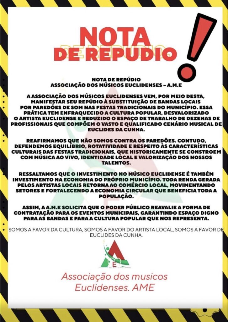 O posicionamento relembra que os músicos fazem parte da história e da construção social de Euclides da Cunha, sendo indispensáveis para que as festas sigam refletindo a identidade do povo.