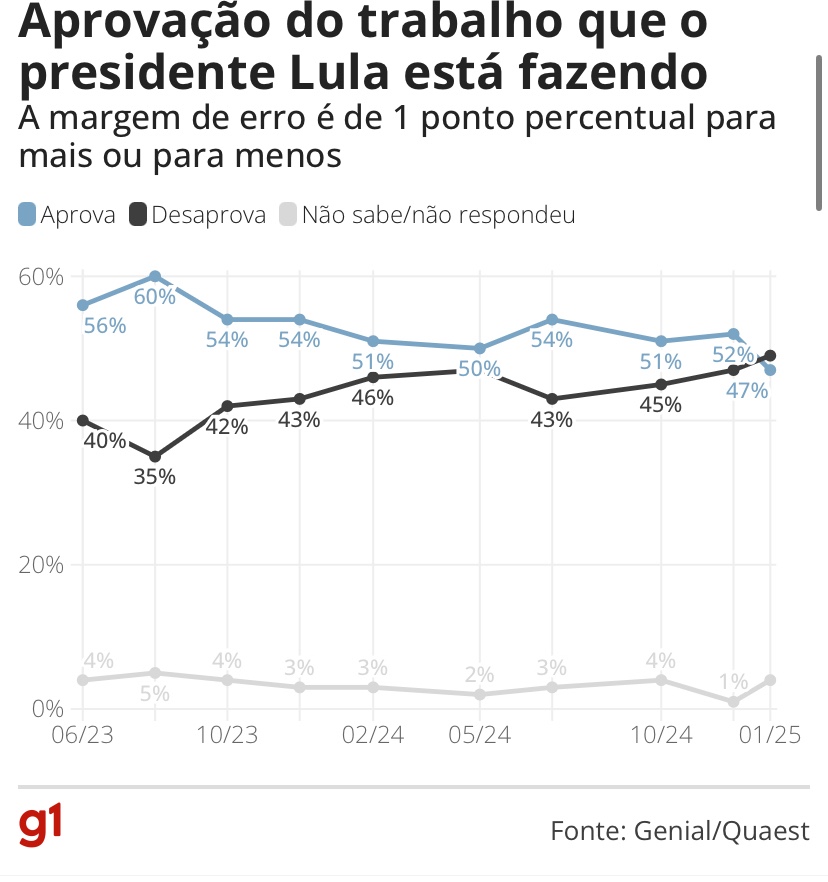 Em relação à pesquisa divulgada em dezembro de 2024, a aprovação do trabalho do presidente caiu 5 pontos, de 52% para 47%, enquanto a reprovação, que era de 47%, agora é de 49%.