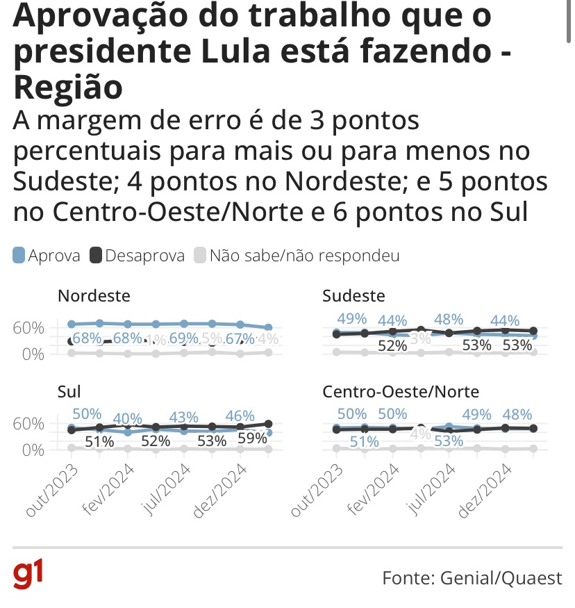 No Sul, a desaprovação de Lula é de 59% (eram 52%) e a aprovação, de 39% (eram 46% em dezembro). A margem de erro para esta região é de 6 pontos percentuais para mais ou para menos.