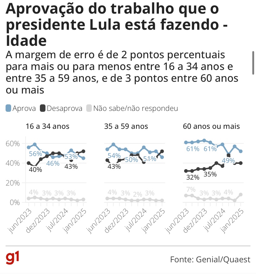Entre os eleitores de 16 a 34 anos, o trabalho de Lula é desaprovado por 52% (eram 50% em dezembro), e é aprovado por 45% (eram 48%).