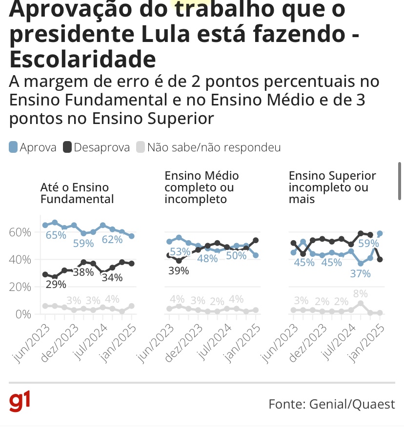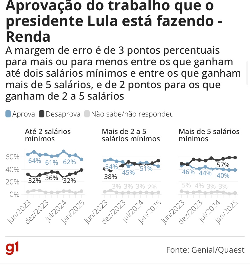 “Primeiro, Lula não consegue cumprir suas promessas. Esse percentual sempre foi alto, mas chegou ao seu maior patamar em jan/25: 65%. Ou seja, mais do que gerar esperança, o atual governo produz frustração na população”, afirma Nunes.