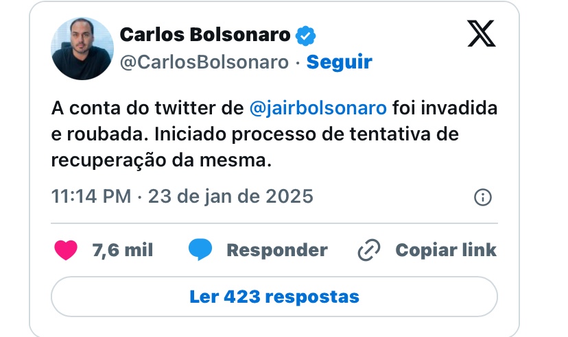 Carlos Bolsonaro se manifestou sobre o incidente em seu próprio perfil na plataforma, confirmando que a conta de seu pai havia sido invadida