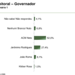 Já no cenário estimulado, quando os nomes dos candidatos são apresentados aos eleitores, ACM Neto amplia a vantagem e aparece com 52,0% das intenções de voto, enquanto Jerônimo Rodrigues soma 27,4%. João Roma (8,1%) e Kléber Rosa (1,5%) também figuram na pesquisa. O percentual de eleitores que declararam voto nulo ou branco chega a 6,8%, e 4,1% não souberam responder.