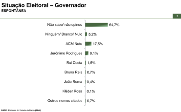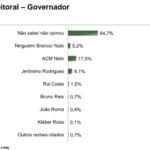 Na pesquisa espontânea, onde os entrevistados citam livremente seus candidatos, 64,7% não souberam ou não opinaram. Entre os que manifestaram preferência, ACM Neto aparece com 17,5%, seguido por Jerônimo Rodrigues, que tem 9,1%. Outros nomes, como Rui Costa (1,5%), Bruno Reis (0,7%) e João Roma (0,4%), foram citados com percentuais menores.