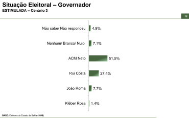 No cenário estimulado 3, ACM Neto consolida sua liderança com 51,5% das intenções de voto, uma vantagem expressiva sobre Rui Costa, que aparece com 27,4%. João Roma registra 7,7%, enquanto Kléber Rosa soma 1,4%. O percentual de votos brancos, nulos ou nenhum candidato chega a 7,1%, e 4,9% dos entrevistados não souberam ou não responderam.