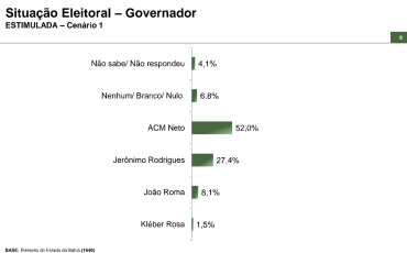 Já no cenário estimulado, quando os nomes dos candidatos são apresentados aos eleitores, ACM Neto amplia a vantagem e aparece com 52,0% das intenções de voto, enquanto Jerônimo Rodrigues soma 27,4%. João Roma (8,1%) e Kléber Rosa (1,5%) também figuram na pesquisa. O percentual de eleitores que declararam voto nulo ou branco chega a 6,8%, e 4,1% não souberam responder.