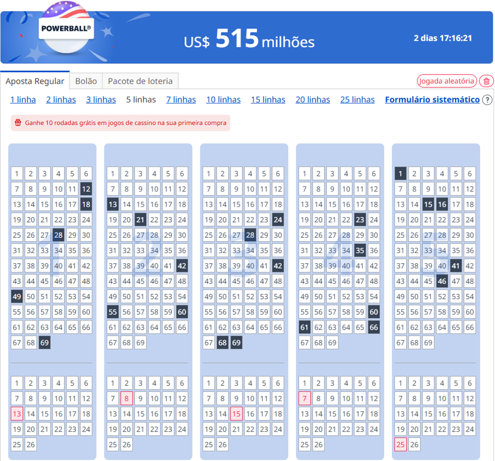 - Escolher 5 números principais e um número adicional “Power Ball”.