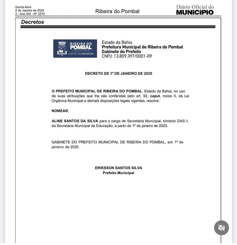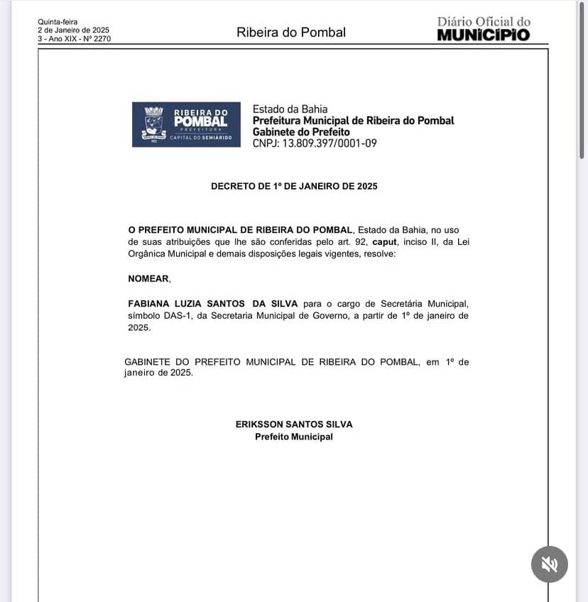 Prefeito de Ribeira do Pombal/BA Eriksson Silva (MDB) nomeia esposa, cunhada como secretárias e primo como tesoureiro.