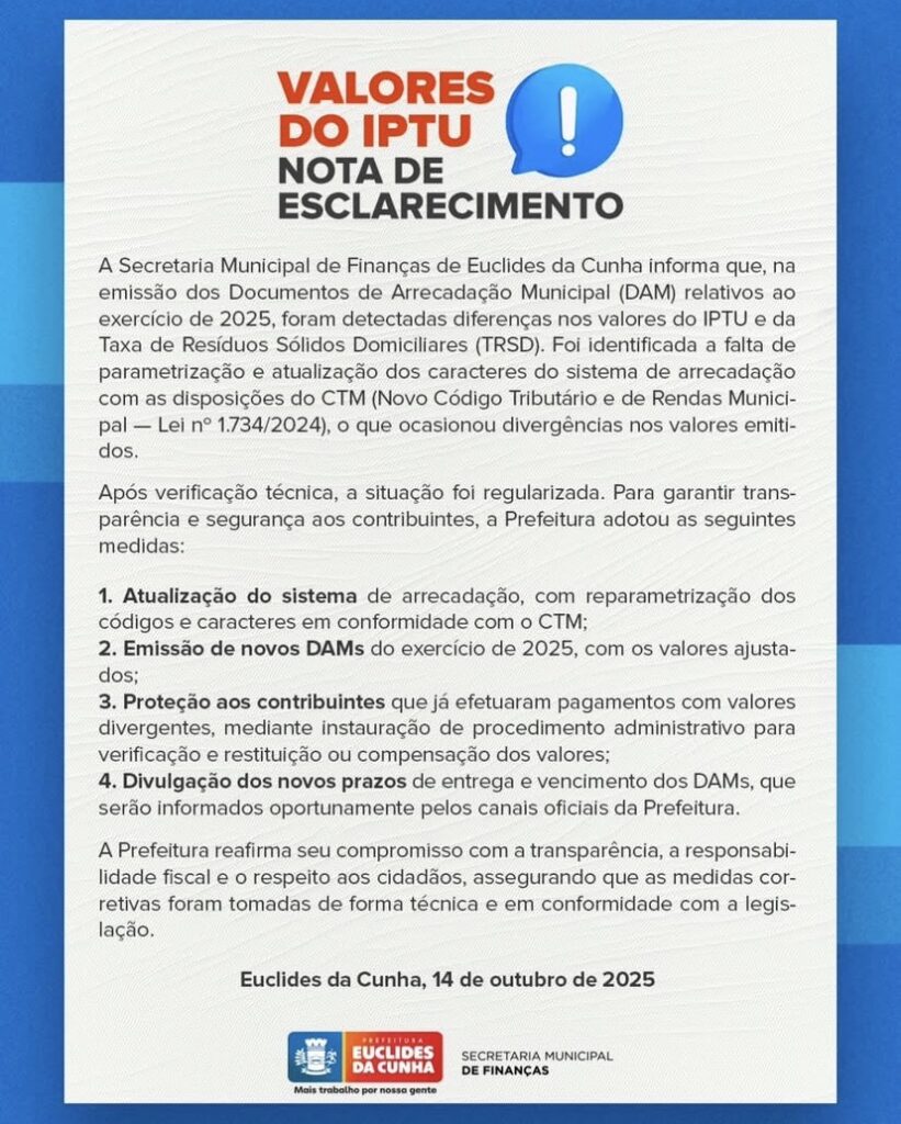 A Prefeitura de Euclides da Cunha divulgou, nesta quarta-feira, uma nota de esclarecimento sobre as diferenças detectadas nos valores do IPTU 2025 e da Taxa de Resíduos Sólidos Domiciliares (TRSD).