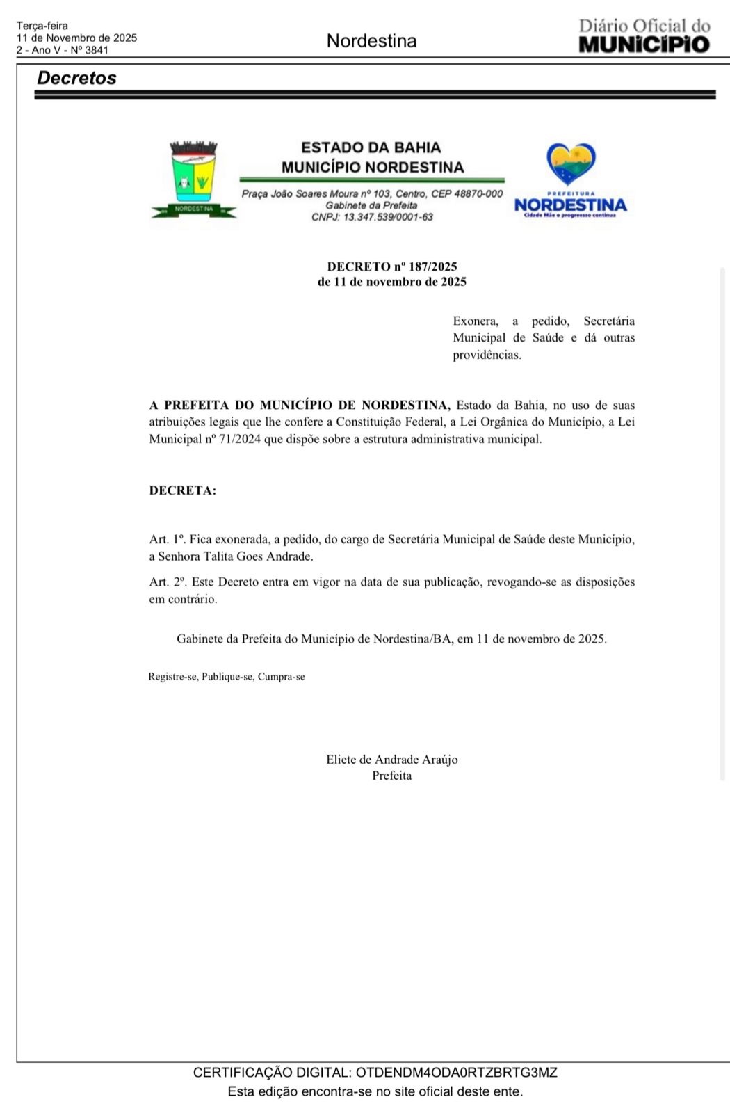 Confirmando rumores que ja corriam na cidade a Prefeitura de Nordestina tem nova Secretaria de Saúde, conforme publicação realizada na data de hoje dia 12/11/2025 no Diário Oficial da Prefeitura de Nordestina.