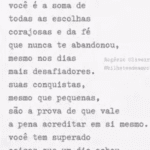 “Você é a soma de todas as escolhas corajosas e da fé que nunca te abandonou, mesmo nos dias mais desafiadores. Suas conquistas, mesmo que pequenas, são a prova de que vale a pena acreditar em si mesmo. Você tem superado coisas que um dia achou que não conseguiria.”