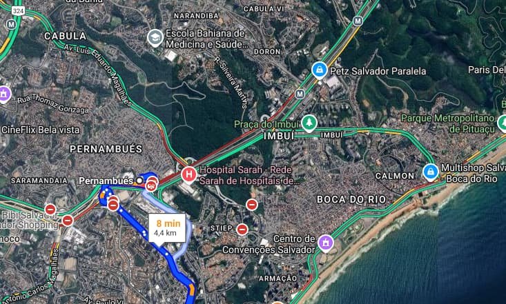 O congestionamento já se estende do bairro do Imbui até a ligação Iguatemi-Paralela (LIP), conforme informações do Google Maps. (Atualização às 08h03)