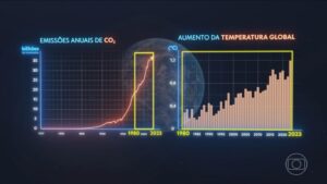 O que todo mundo concorda é que vai ser preciso esperar um ou dois anos para entender se as temperaturas voltarão a cair ou se esse é o novo normal. Mas um fato está claro no gráfico que mostra a quantidade de emissão de CO2 na atmosfera. Percebe-se a mudança da temperatura com o aumento das emissões ao longo dos anos.