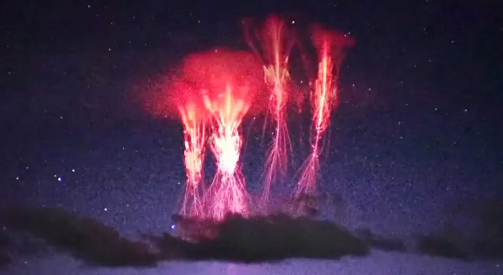 Sprites são um tipo de evento luminoso transiente (TLE) que ocorre entre 50 e 100 km de altura, quase na borda do espaço, bem diferente dos relâmpagos comuns que caem perto das nuvens. Eles podem ter formatos variados, como o famoso “sprite água-viva”, que tem filamentos vermelhos parecidos com tentáculos.