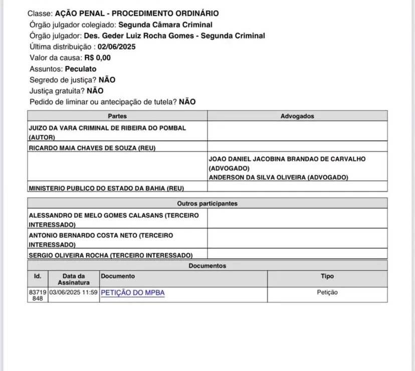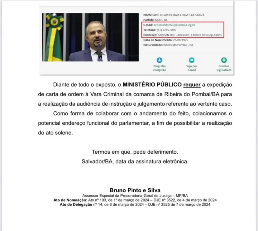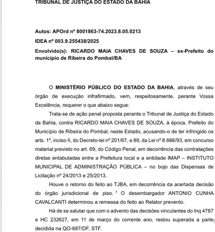 O Ministério Público Estadual (MP-BA) ingressou com uma ação penal contra o deputado federal Ricardo Maia (MDB), ex-prefeito do município de Ribeira do Pombal, no interior da Bahia. A denúncia é baseada em supostas irregularidades na contratação da empresa IMAP, durante sua gestão como prefeito.