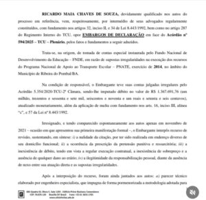O deputado federal Ricardo Maia (MDB) ingressou nesta quarta-feira (11) com embargos de declaração no Tribunal de Contas da União (TCU), em uma tentativa de reverter a decisão que reprovou suas contas. O recurso, considerado o último possível no âmbito do tribunal, é interpretado por analistas como uma medida para adiar os impactos legais da condenação.
