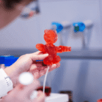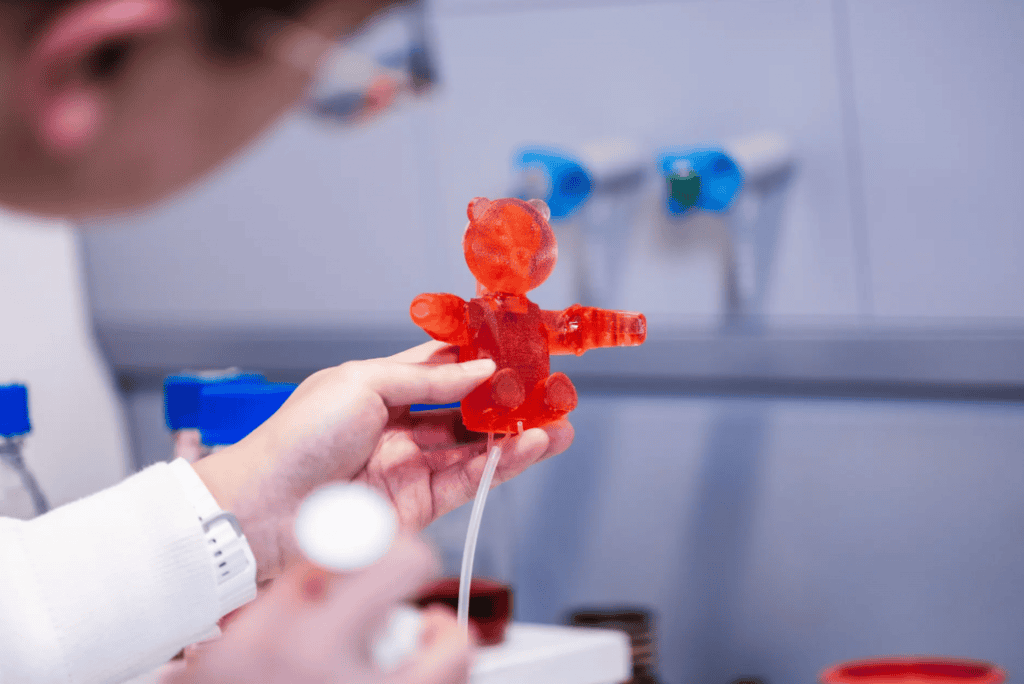 O RoboCake apresenta dois ursinhos de pelúcia robóticos totalmente comestíveis com sabor de gomas de romã, feitos de gelatina, xarope e corantes. “Eles são animados por um sistema pneumático interno: quando o ar é injetado por meio de canais dedicados, suas cabeças e braços se movem”, explica o pesquisador Bokeon Kwak.