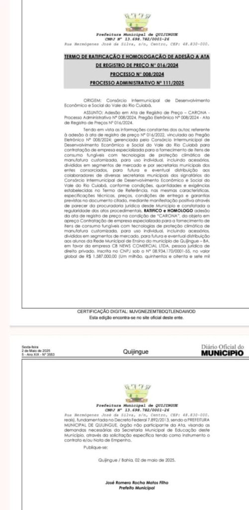 Em vez de concluir a licitação aberta para compra de uniformes, a Prefeitura de Quijingue optou por cancelar o processo e aderir à Ata de Registro de Preço nº 016/2024 / Processo nº 008/2024 / Processo Administrativo nº 111/2025, vinculada à empresa investigada.