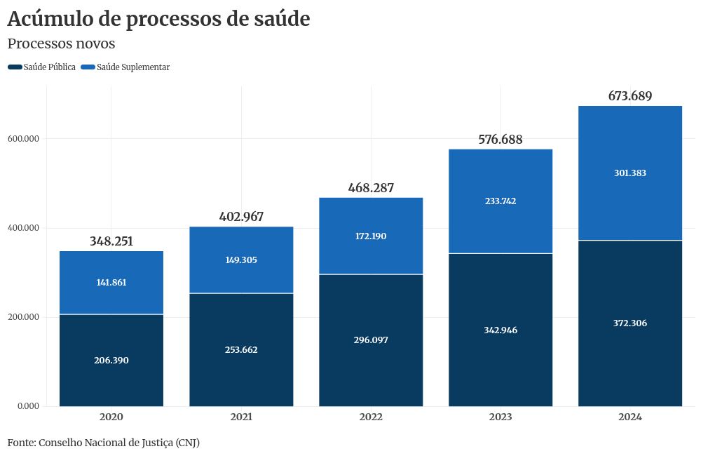 De 2020 a 2024, foram 2,47 milhões de novos processos ao todo. No período, a saúde pública respondeu por 59,6% (1,47 milhão) deles, enquanto a saúde suplementar alcançou 0,99 milhão, 40,4% do total.