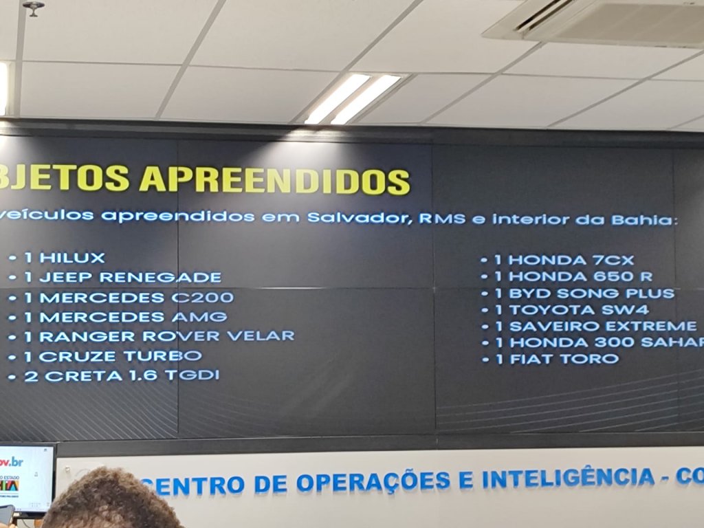 Entre os veículos apreendidos pela polícia estão uma Hilux, um Jeep Renegade, duas Mercedes (C200 e AMG), uma Range Rover Velar, um Cruze e dois Creta. Além de Honda 7CX, Honda 650 R, BYD Song Plus, Toyota SW4, Saveiro, Honda 300 e uma Fiat Toro.