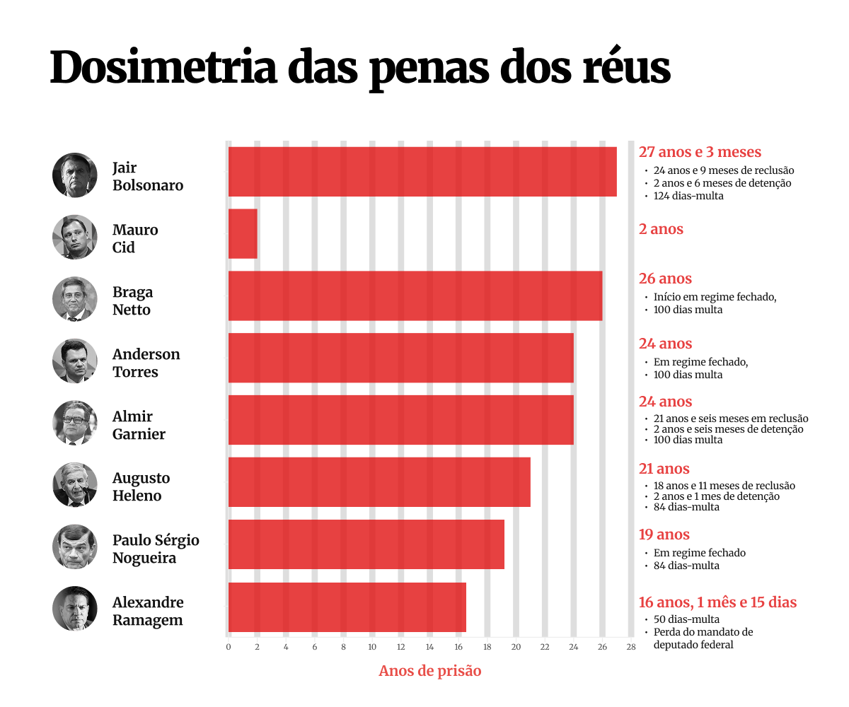A maior pena foi aplicada ao ex-presidente Jair Bolsonaro. Os demais réus receberam penas de 2 anos a 26 anos de prisão. O tenente-coronel Mauro Cid foi o que teve a menor sanção, de 2 anos, em função do termo de colaboração premiada firmado com a Justiça.