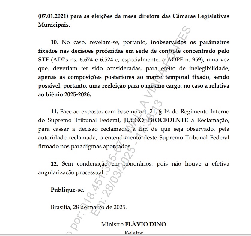 Na determinação, o ministro Flávio Dino entendeu que o afastamento do vereador não era adequado e ordenou seu retorno imediato ao cargo. A decisão pode impactar diretamente o cenário político local, uma vez que a Câmara Municipal estava sem liderança desde a saída de Frederico.