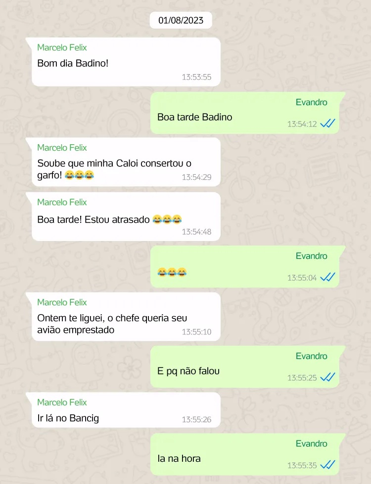 Nas mensagens, Evandro e Marcelo usam termos como “caloi”, “platitas”, “laplatina”, “garfo”, “soldas” e “praguinhas” para se referir a dinheiro. De acordo com a reportagem, em vários trechos, Marcelo cobra pagamentos e menciona valores. Em outubro de 2024, ele pede um Pix de R$ 20 mil. Evandro responde que conversariam no dia seguinte.