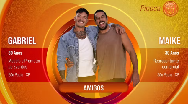 Gabriel e Maike (amigos): os amigos de 30 anos moram na cidade de São Paulo e se conhecem desde os 13 anos. Gabriel é modelo e promotor de eventos e está namorando, enquanto Maike, solteiro, trabalha como representante comercial.