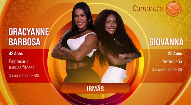 Gracyanne Barbosa e Giovanna: as irmãs de 42 e 26, são naturais de Campo Grande (MS). Apaixonadas por atividade física, as duas gostam de compartilhar suas rotinas saudáveis nas redes sociais. Gracyanne segue um estilo de vida regrado, com exercícios e dietas intensas. Giovanna, que se formou em veterinária afirma que a irmã é a maior inspiração dela pela força e dedicação que Gracyanne tem.