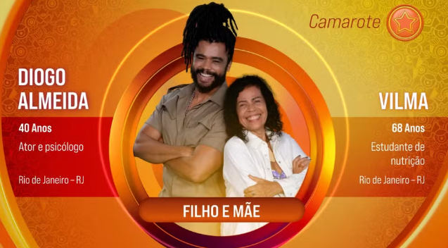 Diogo Almeida e Vilma (filho e mãe):o ator carioca e psicólogo de 40 anos, foi protagonista da novela “Amor Perfeito” (2023), e levou a mãe, natural de Aracaju, em Sergipe, para participar do jogo com ele. A ideia era que dona Vilma se inscrevesse com o marido, porém, com o tempo, eles entenderam que a dupla teria que ser o filho.