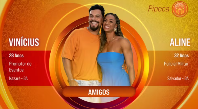 Aline Patriarca e Vinícius (amigos): os de 32 e 28 anos, são amigos e estão solteiros. Aline e Vinícius se conheceram há sete anos a caminho de um trabalho em Salvador e desde então, nunca mais se afastaram. A baiana se apresentou como policial militar, mas já era conhecida na web como influenciadora digital. Já Vinícius é formado em arquitetura e atua como promotor de eventos.