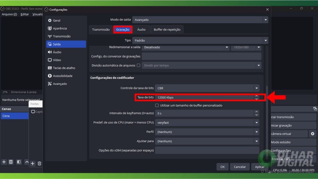 - No “Codificador de Vídeo”, escolha x264 se estiver usando CPU, ou NVENC (para placas NVIDIA) e AMD VCE (para placas AMD).