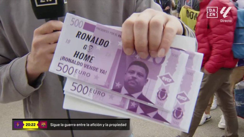 O Real Valladolid vive uma de suas piores temporadas na história recente, com apenas 16 pontos somados e já matematicamente rebaixado. A sequência de resultados negativos, agravada por um futebol considerado inexpressivo, culminou em novos protestos da torcida no último sábado (3), durante a derrota por 2 a 1 para o Barcelona, com notas falsas de 500 euros estampadas com o rosto do presidente do clube, Ronaldo Nazário, sendo lançadas nas arquibancadas do Estádio José Zorrilla.