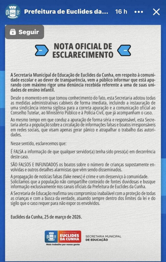 O Euclides Diário permanece a disposição dos envolvidos através dos seus canais de comunicação para quaisquer esclarecimentos que julgarem necessários.