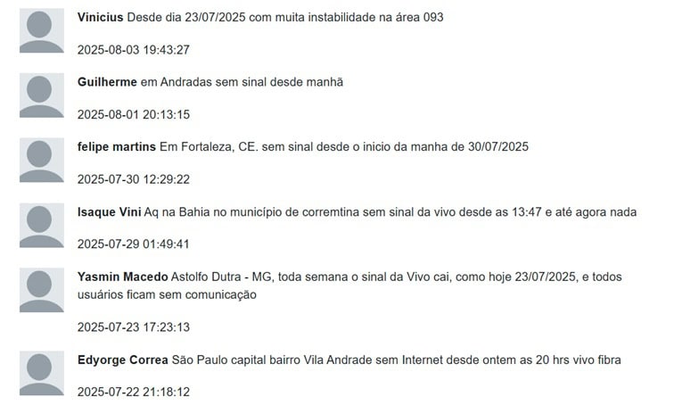 Nos comentários da página da Vivo no Downdetector, usuários também relataram instabilidades no serviço da operadora nos últimos dias, incluindo falta de sinal em municípios do Ceará, Bahia, Minas Gerais e São Paulo.