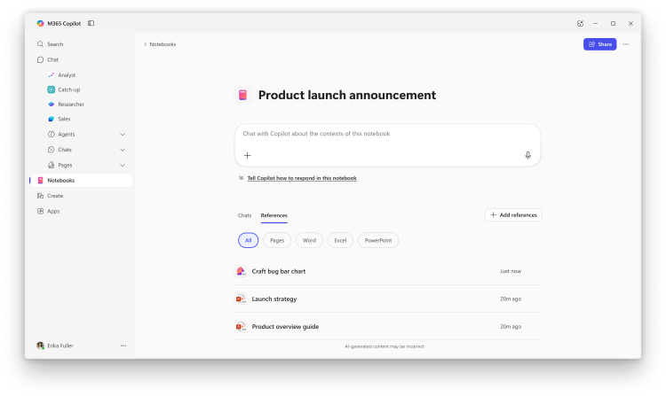 - Pages, ferramenta colaborativa que permite coedição entre humanos e IA, baseada na tecnologia do Microsoft Loop e integrada ao Outlook, Teams e demais apps do ecossistema Microsoft.